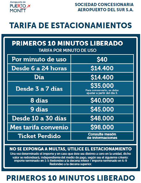 “Sociedad Concesionaria Aeropuerto del Sur S.A”. Informa sobre las tarifas del estacionamiento público del Aeropuerto.